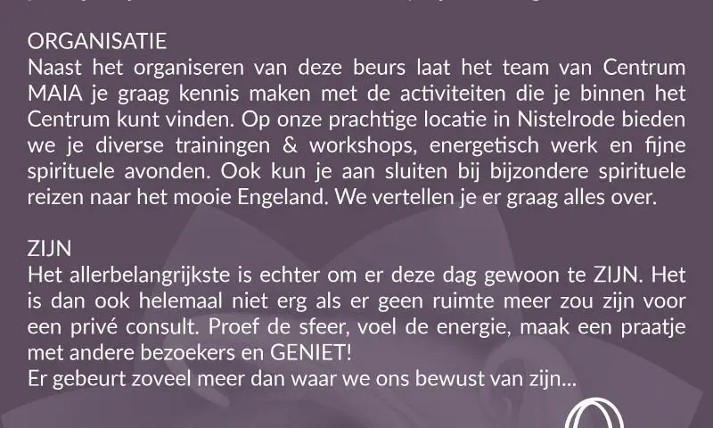 Naast het organiseren van deze beurs laat het team van Centrum MAIA je graag kennis maken met de activiteiten die je binnen het Centrum kunt vinden. Op onze prachtige locatie in Nistelrode bieden we je diverse trainingen & workshops, energetisch werk en fijne spirituele avonden. Ook kun je aan sluiten bij bijzondere spirituele reizen naar het mooie Engeland. We vertellen je er graag alles over.