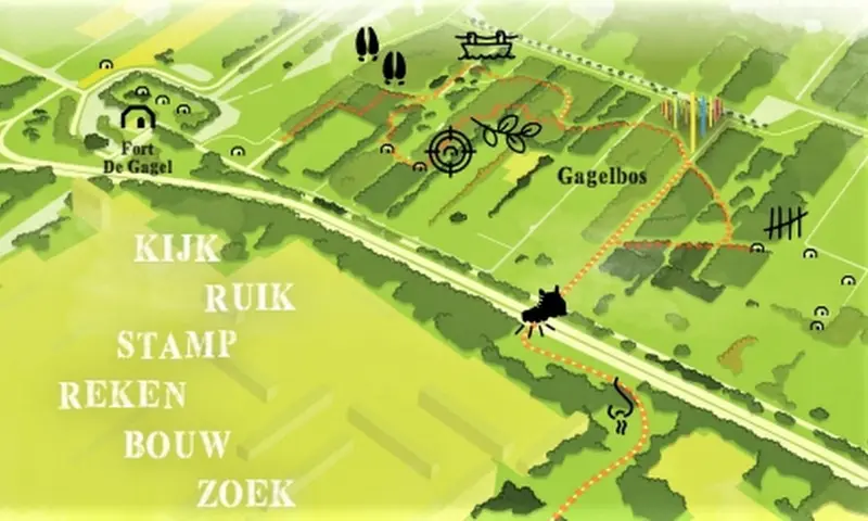 Rondleidingen in Fort De Gagel om 13:30 uur, 14:30 uur en 15:30 uur. Vanaf Stadsboerderij Gagelsteede kunt u het spoor volgen van gekleurde stippen en palen naar het Gagelbos en ontdek je een stukje. Nieuwe Hollandse Waterlinie met de Speelbos Gagelbos Challengekaart.