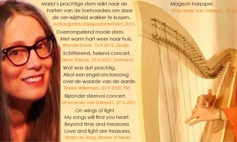 Marja de Jong (Master of Music) zingt met harp en andere instrumenten in 6 talen over liefde, licht, leven en de natuur. Voor ieder wat wils: haar repertoire varieert van Middeleeuws tot Folk, van Meditatief tot Swing. Diepgang met een vrolijke noot. Marja's warme stem reikt naar de harten van de toehoorders, om daar de oerwijsheid wakker te kussen. “Met een open hart maak je wijzere keuzes,” zegt ze. Marja de Jong begeleidt zichzelf op een prachtige Rees Brilliant harp van bijna 5 octaven, met een ronde, warme klank.