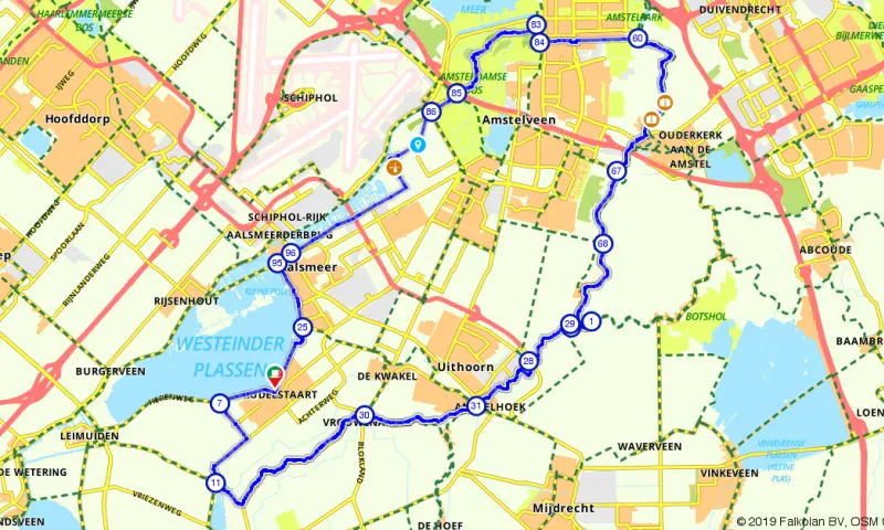 Startpunt van deze fietsroute is het gezellige Café Op de Hoek in Kudelstaart. Je fietst eerst naar het Fort bij Kudelstaart. Hier zijn twee van de twee fortwachterswoningen en de bergloods nog aanwezig, net als de gracht. Je rijdt verder langs `de Poel` zoals de Aalsmeerders de Westeinderplassen noemen. Langs de oevers liggen zo´n 50 jachthavens. Toch zwemt hier de snoek, paling en de zeldzame Europese meerval. Aalsmeer is wereldberoemd dankzij de levendige bloemenhandel die zich in en om het plaatsje ontwikkelde. Al snel kom je door Ouderkerk aan de Amstel. Je ziet hier een mix van oude en nieuwe panden. Via het Amsterdamse Bos fiets je naar de Amstel en de Rondehoep. Net als de Beemster is deze polder een karakteristiek ontginningslandschap met een unieke historie.