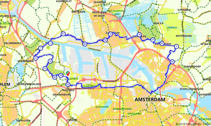 Je route gaat van start met een kop koffie bij Brasserie Halverwege, pal aan de waterkant in het Geuzenbos. Je bent er zo vanaf de snelweg, dus je hoeft niet met de fietsendrager de stad in. Hiervandaan fiets je Amsterdam in. Je rijdt over de gezellige Haarlemmerdijk en neemt dan de pont over het IJ. Geniet van het prachtige uitzicht op de skyline van de stad en het EYE Filmmuseum. Door het hippe Amsterdam-Noord fiets je de stad weer uit, naar Zaandam. Je zit zomaar ineens midden in de polder! Langs het water fiets je weer terug naar je startpunt.
