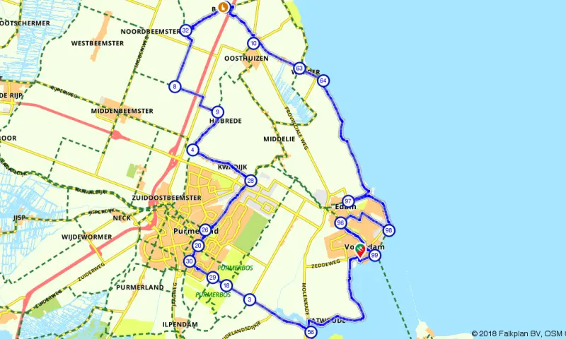 In Beets passeer je het vijftiende-eeuwse dorpskerkje met zijn opvallend lage toren. Via Kwadijk rij je naar Purmerend, waarna je een stukje door het Purmerbos fietst: een uitzondering in dit weidse polderland. Katwoude is een mooi plaatsje om op je gemak doorheen te fietsen, je ziet er enkele fraaie gebouwen. Vanaf de dijk kijk je vervolgens mooi uit over de Gouwzee. Even uitwaaien, terwijl je aan de horizon het eiland Marken ziet liggen.