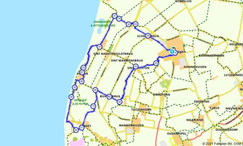 Begin je fietsroute bij Hotel Marktstad in Schagen. Geniet van een bourgondische lunch, een lekkere kop koffie of een borrel voordat je de fiets opstapt. Of nadat je klaar bent met fietsen natuurlijk, dan kun je lekker bijkomen en nagenieten van deze mooie route. Vanuit Schagen fiets je naar Schagerbrug en de Hondsbossche Zeewering. Dit is een dijk van 5,5 kilometer vlakbij Petten, op een plaats waar een stormvloed in de Middeleeuwen door de oorspronkelijke duinen is doorgebroken. Fiets hier heerlijk met je haren in de wind, genietend van het mooie uitzicht. Het gebied waar je doorheen fietst staat bekend om de bollenvelden. In het voorjaar staan de bollen in bloei, dus is het hier prachtig fietsen! Via Petten en Sint Maarten fiets je weer terug naar Schagen.