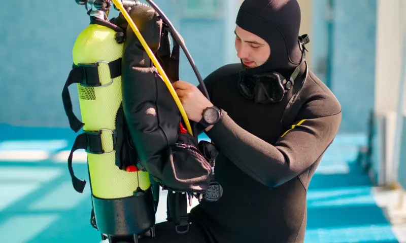 Na een korte uitleg ga je al snel onder leiding van een ervaren instructeur het zwembad in, om kennis te maken met het ademhalen onder water met behulp van persluchtapparatuur.