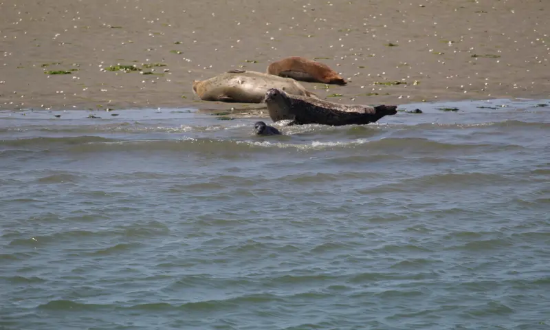 We varen onder de Zeelandbrug door, naar de zandbank waar de zeehonden op ongeveer 50 meter afstand gezien worden. We vragen bij deze zandbank stilte, zodat we ze niet verstoren. Te veel geluid veroorzaakt onrust bij de groep zeehonden.