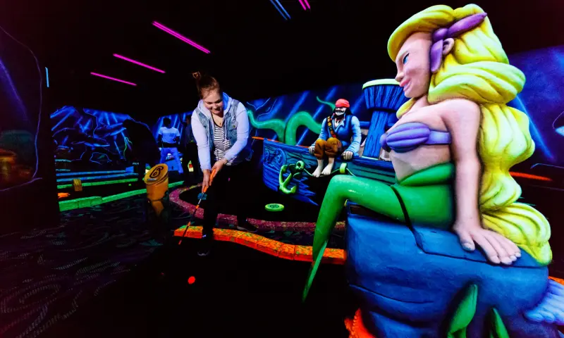 Glowgolf is een superleuke activiteit voor het hele gezin een bedrijfsuitje of vrijgezellenfeest. Glowgolf kan het hele jaar door gespeeld worden. In de winter is het comfortabel warm en in de zomer zorgen de airco's voor een COOL rondje golf. Het thema is `` Muziek `` . Je speelt minigolf in een waanzinnig fluorescerend decor en ontdekt de wereld van muziek vanaf de jaren 50 tot het heden! De golfbaan staat vol met fraaie decorstukken en de vele hindernissen dagen je uit om een hole in one te slaan, gaat het jullie lukken?