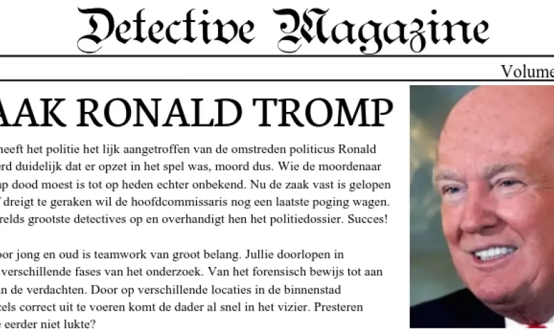 Midden in de stad heeft het politie het lijk aangetroffen van de omstreden politicus Ronald Tromp. Al snel werd duidelijk dat er opzet in het spel was, moord dus. Wie de moordenaar is en waarom Tromp dood moest is tot op heden echter onbekend. Nu de zaak vast is gelopen en in het archief dreigt te geraken wil de hoofdcommissaris nog een laatste poging wagen. Hij trommelt ‘s werelds grootste detectives op en overhandigt hen het politiedossier. Succes!