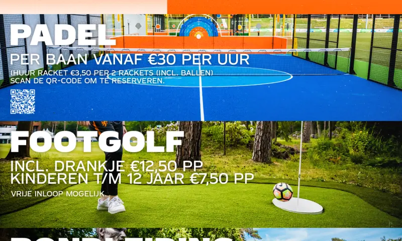 Speel een potje Footgolf, huur een padelbaan of laat je rondleiden door het hart van het Nederlandse voetbal! Kijk rond op de middenstip van Nederland en geniet van een kopje koffie!