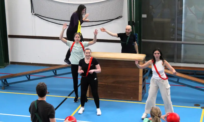 ✔ Een gymzaal vol met gymspullen en obstakels
