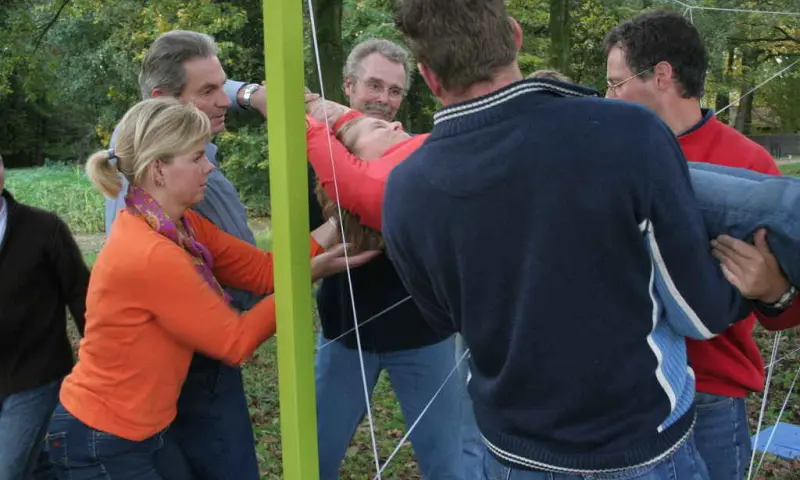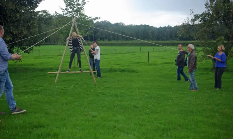 De deelnemers bouwen met de aanwezige balken een grote A. Gesitueerd in een cirkel zal men met 1 persoon op de dwarsbalk van de ‘A’ de oversteek moeten maken.