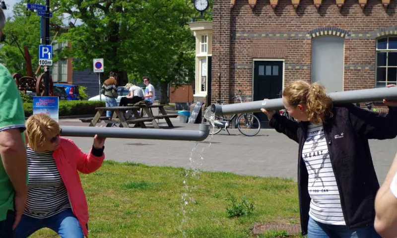 Iedere persoon heeft een (lichtgewicht) buis met zwanenhals van 2 meter op haar schouder en vormen een ketting.