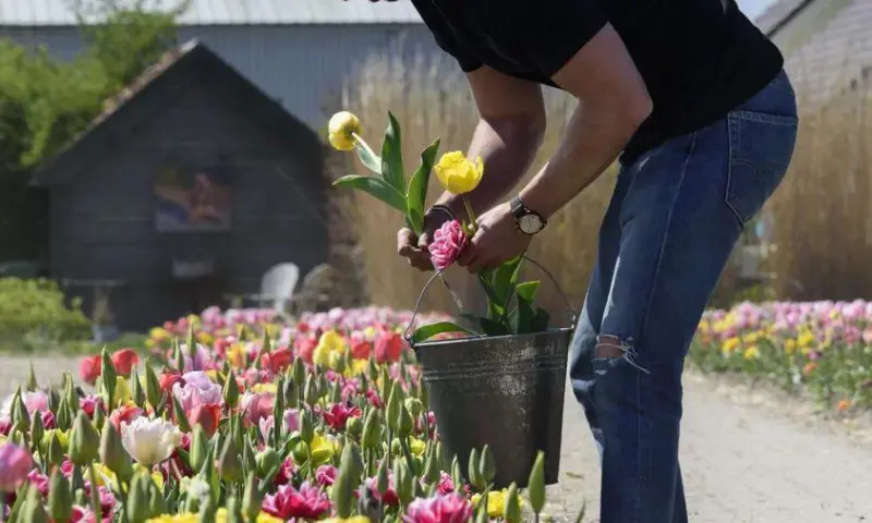 Als je klaar bent met plukken kan je binnen je emmer met tulpen afrekenen.
