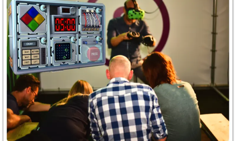 Kies het teamlid uit dat als eerst het avontuur aangaat in virtual reality. De rest van het team heeft een cryptische handleiding om mee te werken. Heb jij de meeste bommen ontmanteld na 60 minuten?