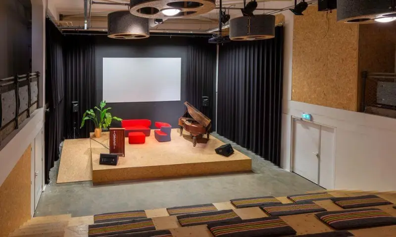 Er zijn twee ruime vergaderzalen en een klein theater, waar je tot 100 personen terecht kan. Maar je kunt ook de hele hub afhuren, of de MakersSpace. De inrichting is speels en veelal circulair.