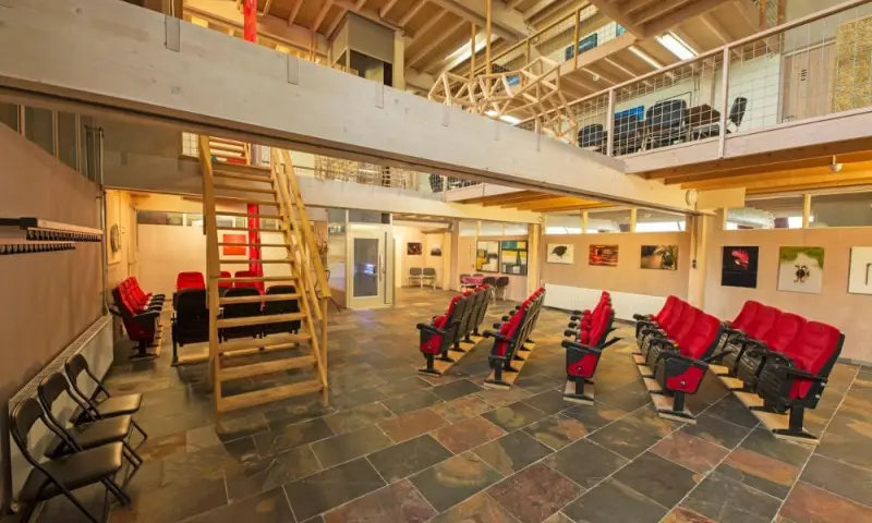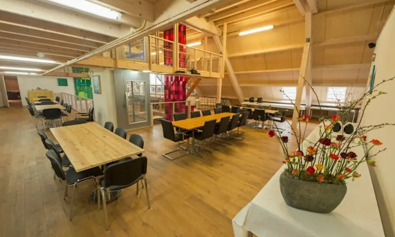 In de romp van de boerderij vind je de centrale ruimte, waar je met 50 mensen in theateropstelling past. Met de hoge plafonds en het vele hout en licht, is dit een bijzondere setting voor je bijeenkomst.