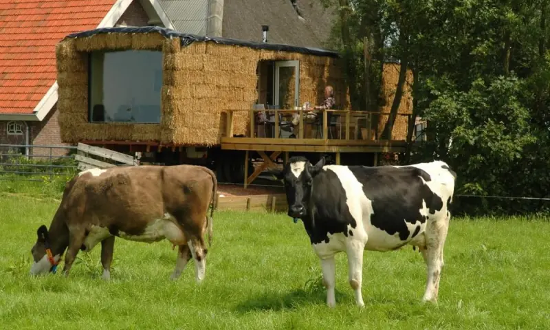 Van de appartementen is de strowagen erg bijzonder. Net iets boven de grond, met een gigantisch raam van waardoor je vrij uitzicht hebt over de weilanden en het water, voel je je in deze wagen haast zweven in het landschap.