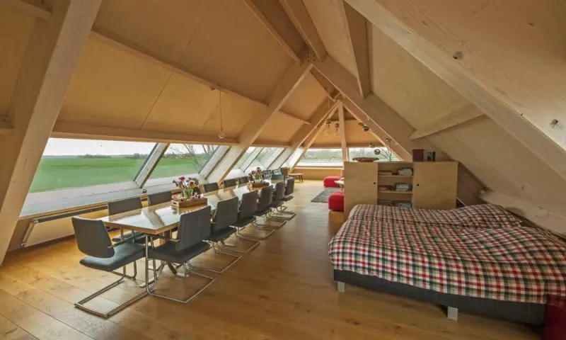 De interne lift brengt je naar de loft op de tweede etage, waar je een appartement vindt van 200 m2 met prachtig uitzicht. Deze ruimte is multifunctioneel. Zowel geschikt voor een groep die wil overnachten als in te zetten als boeren-boardroom. Afke serveert hier eten uit als je wil, maar zelf koken kan ook in de goed geoutilleerde keuken.