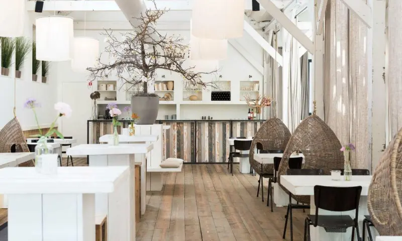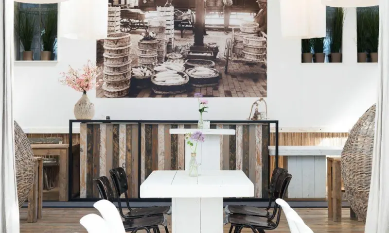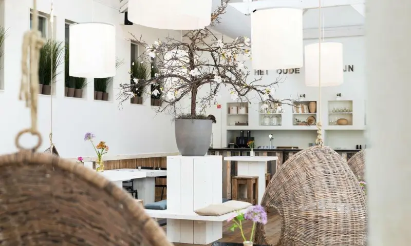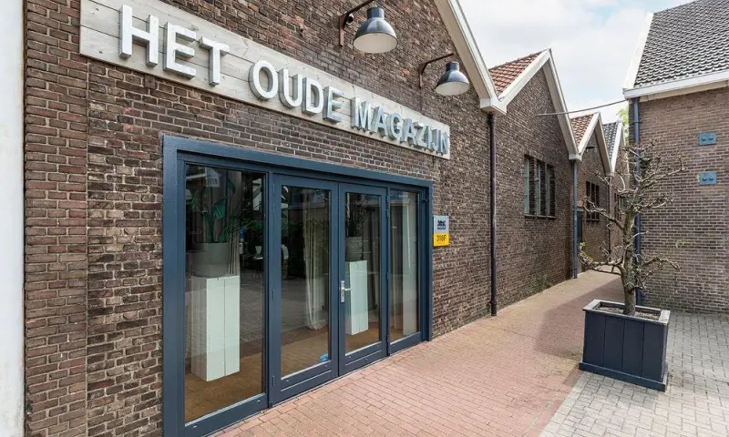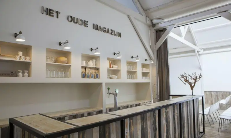 Dankzij het industriële sheddak heeft Het Oude Magazijn een prachtige daglichtinval. Het interieur is warm en deels circulair ingericht. Door het gebruik van veel wit, rustige kleuren, de robuuste houten balken en natuurlijke materialen heeft het een heel prettige sfeer.