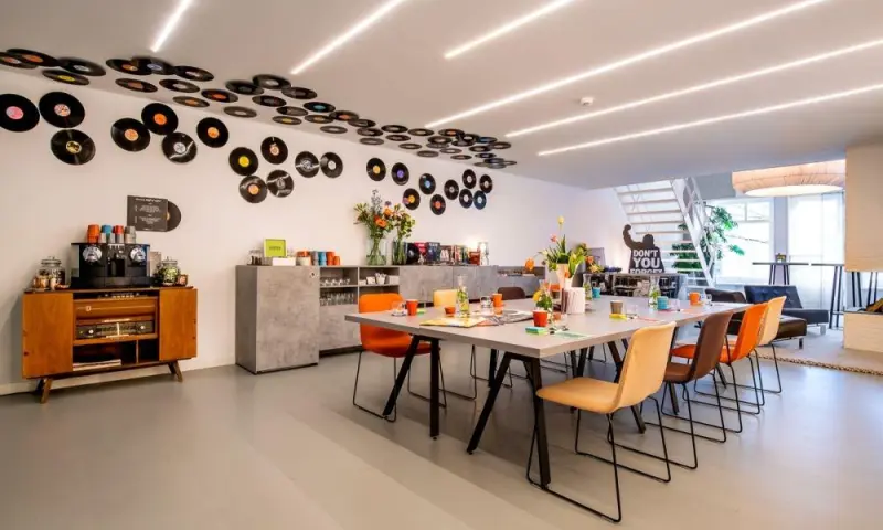 De locatie heeft een heerlijk dakterras, een breakout room op de vide en een ruime vergaderplek op de begane grond. Hier kun je ook gezellig bij de open haard gaan zitten. Alles ademt vinyl en muziek. Je kunt bijvoorbeeld de 'Wall of Fame' met platenhoezen inrichten naar het thema dat bij je bijeenkomst past. Bij binnenkomst speelt er muziek, de deelnemers aan je meeting voelen zich direct thuis. En -ook niet onbelangrijk- het Aura Smart ventilatiesysteem zorgt continu voor frisse lucht.