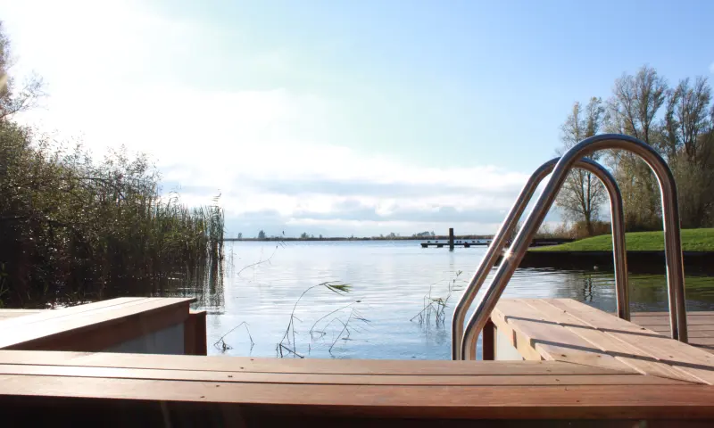 De Finse sauna heeft een schitterend uitzicht op de Friese meren. Naderhand kun je even afkoelen in het meer. Daarnaast is er een blote-voeten-pad en een stoomcabine, verschillende douches en voetenbaden.